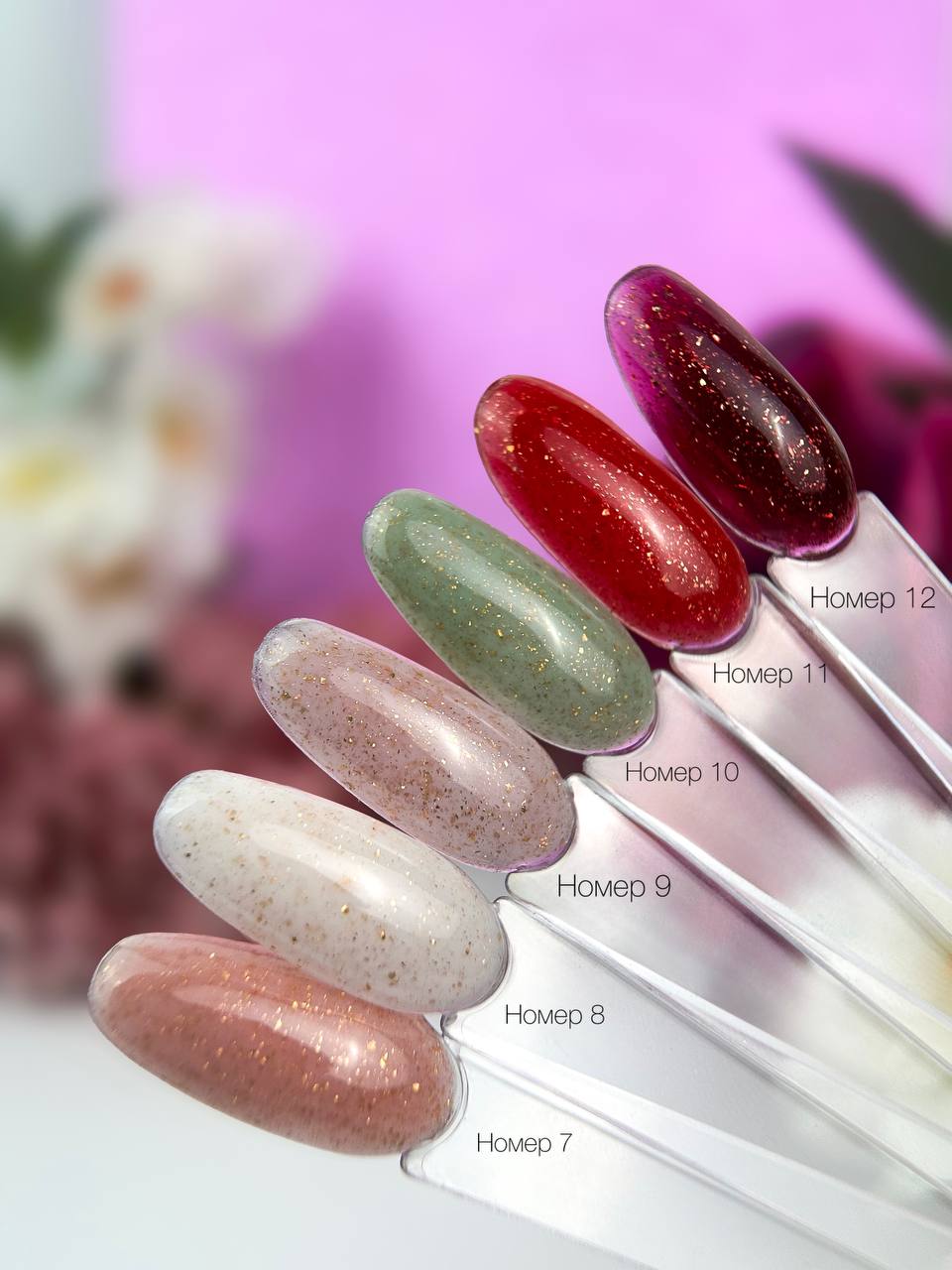 Ніжні гелі з м’якою молочно-нюдовою основою, у які рівномірно додано дрібну золоту фольгу. Відтінки варіюються від світлого молочного до бежево-рожевих та теплих пудрових тонів. Золота поталь створює делікатне сяйво, додаючи покриттю елегантності та ефекту «дорогого» натурального манікюру.
