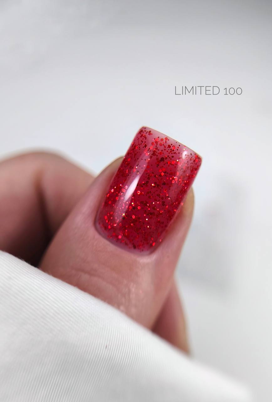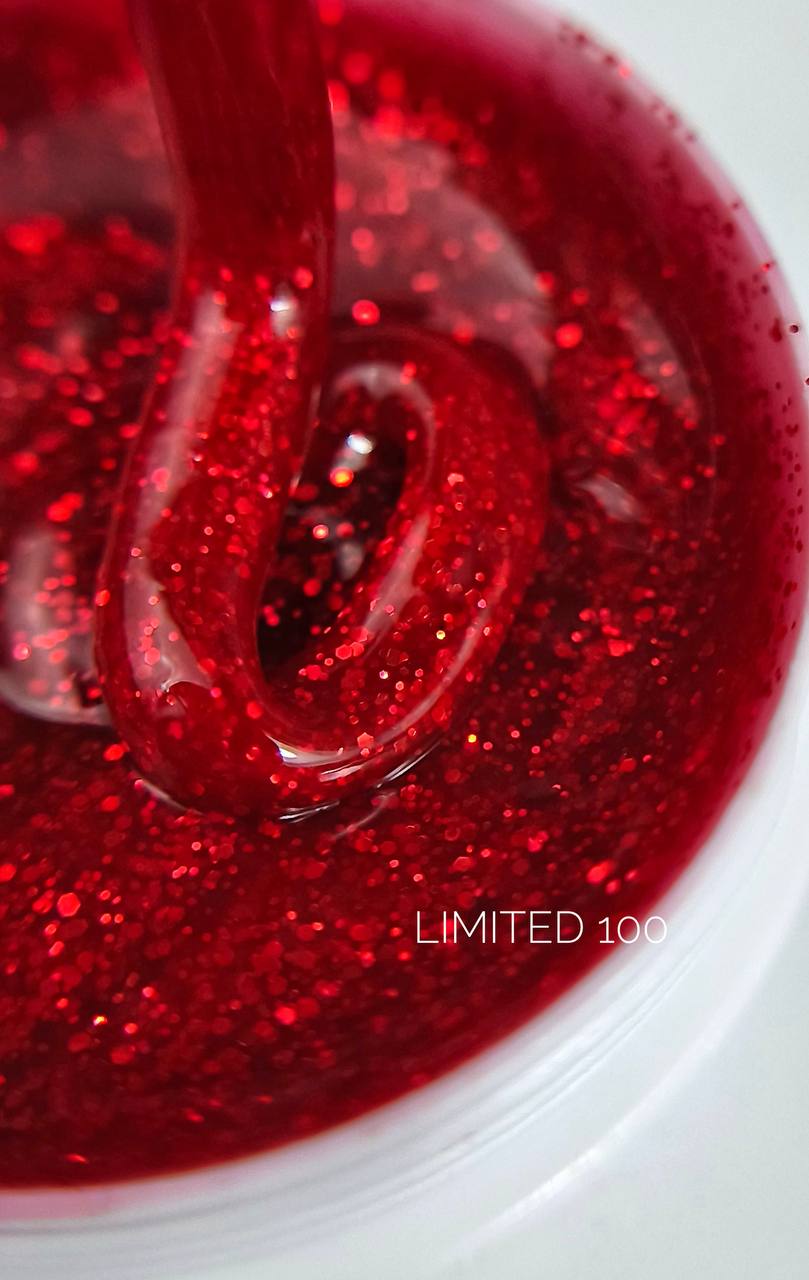 Гель має середню консистенцію та добре самовирівнюється, що робить його зручним у роботі для майстрів будь-якого рівня. Насичений червоний відтінок із сяйливими блискітками створює яскравий та святковий ефект на нігтях.