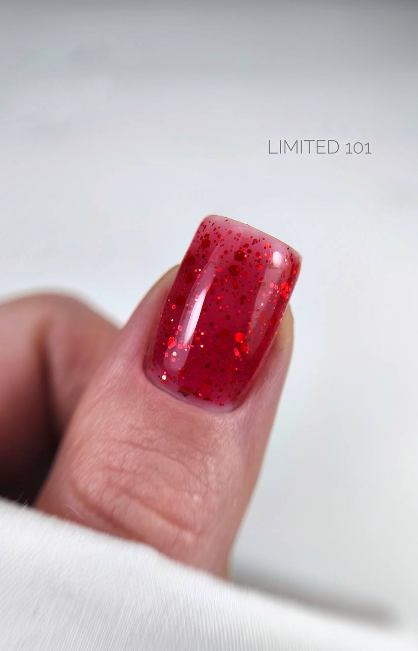 Гель має середню консистенцію та добре самовирівнюється, що робить його зручним у роботі для майстрів будь-якого рівня. Насичений червоний відтінок із сяйливими блискітками створює яскравий та святковий ефект на нігтях.